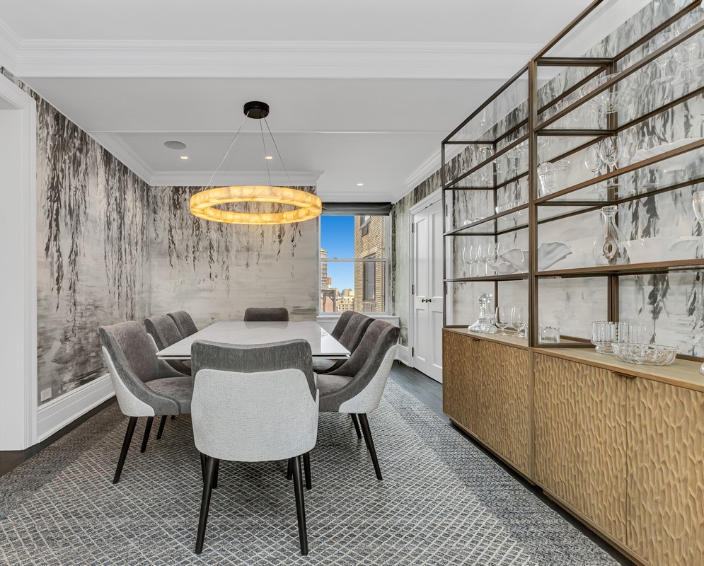 The grand dining room, wrapped in custom Phillip Jeffries wall coverings, enjoys sweeping north views. The expansive windowed eat-in kitchen and breakfast room are appointed with quartz countertops, shaker-style glass and wood cabinetry, wine cooler, and appliances from Viking, Sub-Zero, and Bosch.