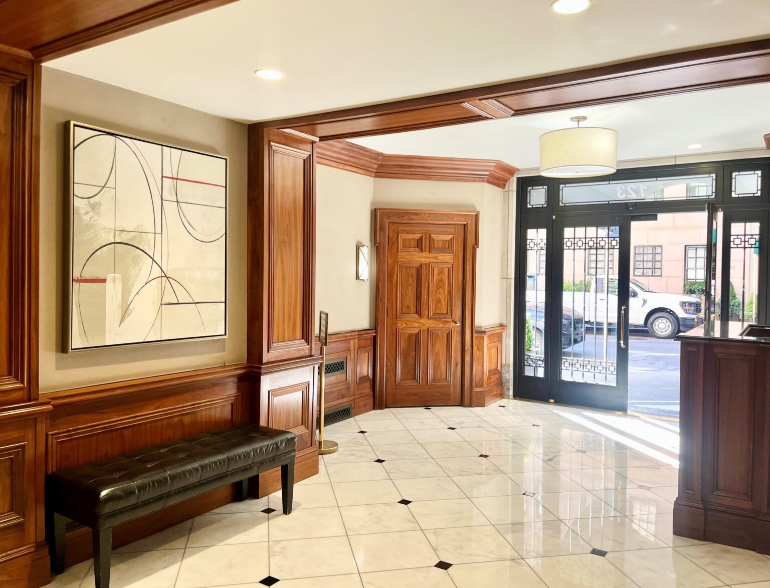 The foyer accommodates dining or a home office and has a wall of closets. The renovated kitchen has marble counters, new full-size stainless appliances including a dishwasher, and cabinets with plentiful storage plus a pantry closet.