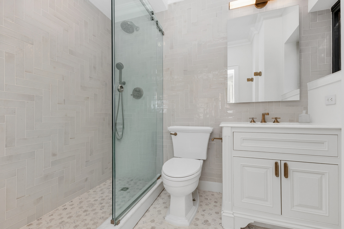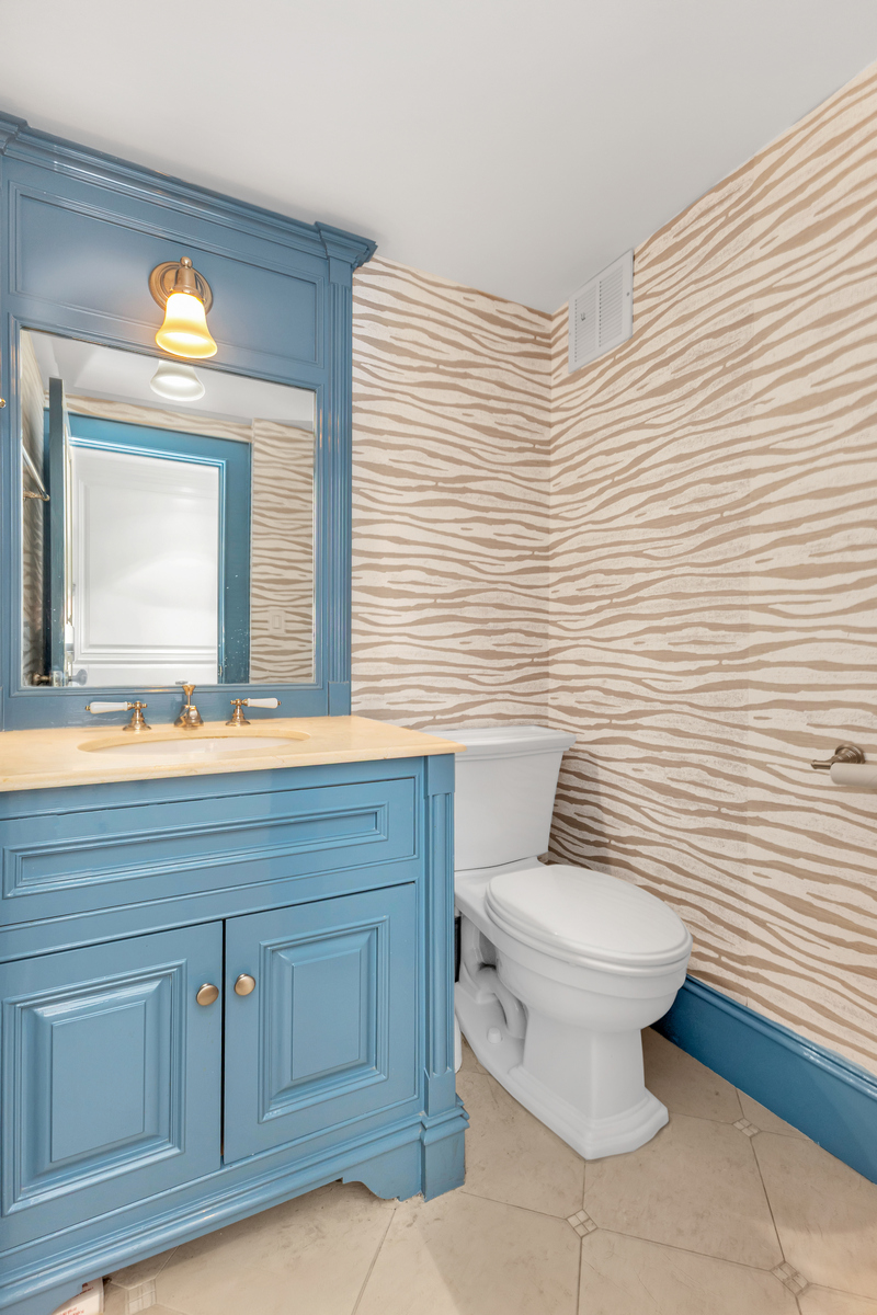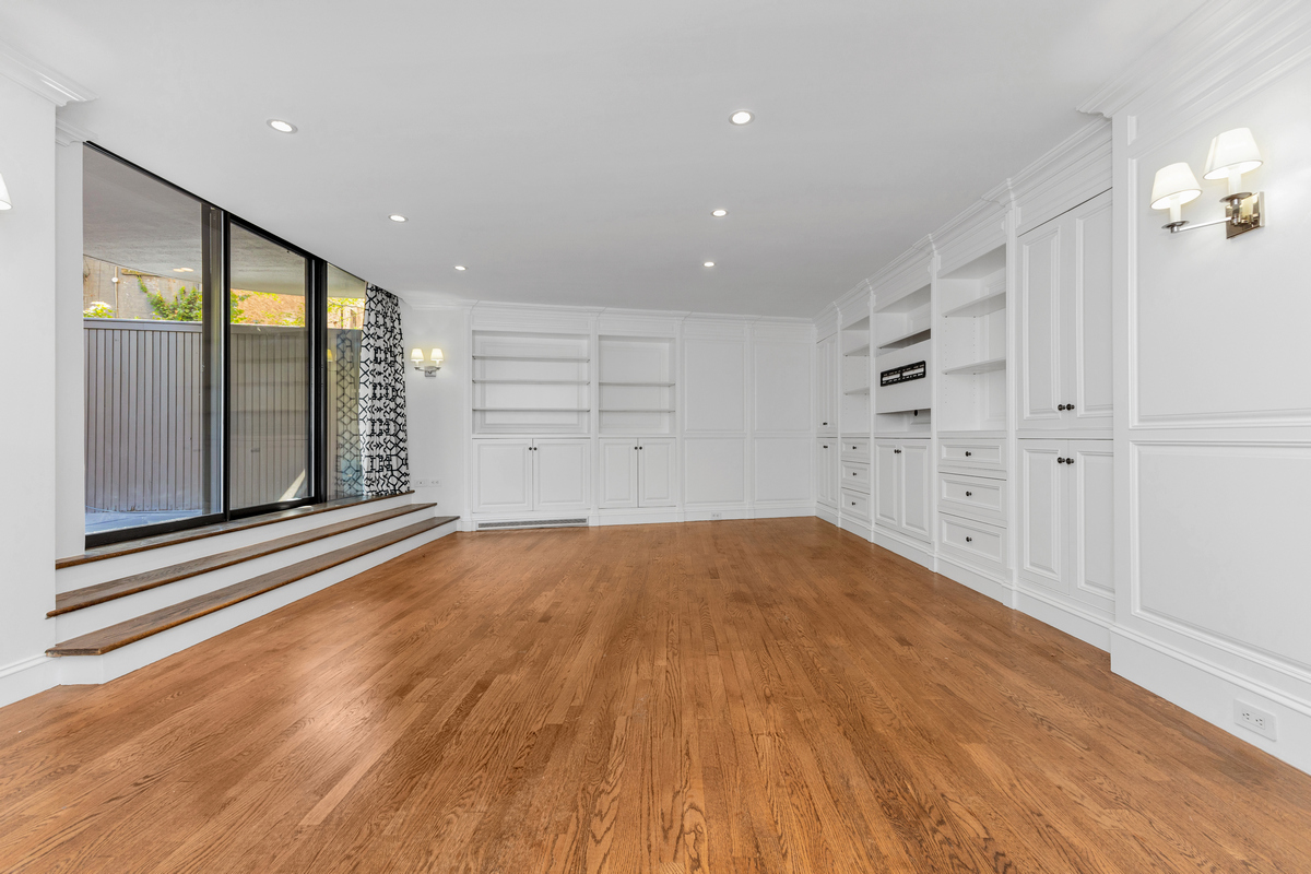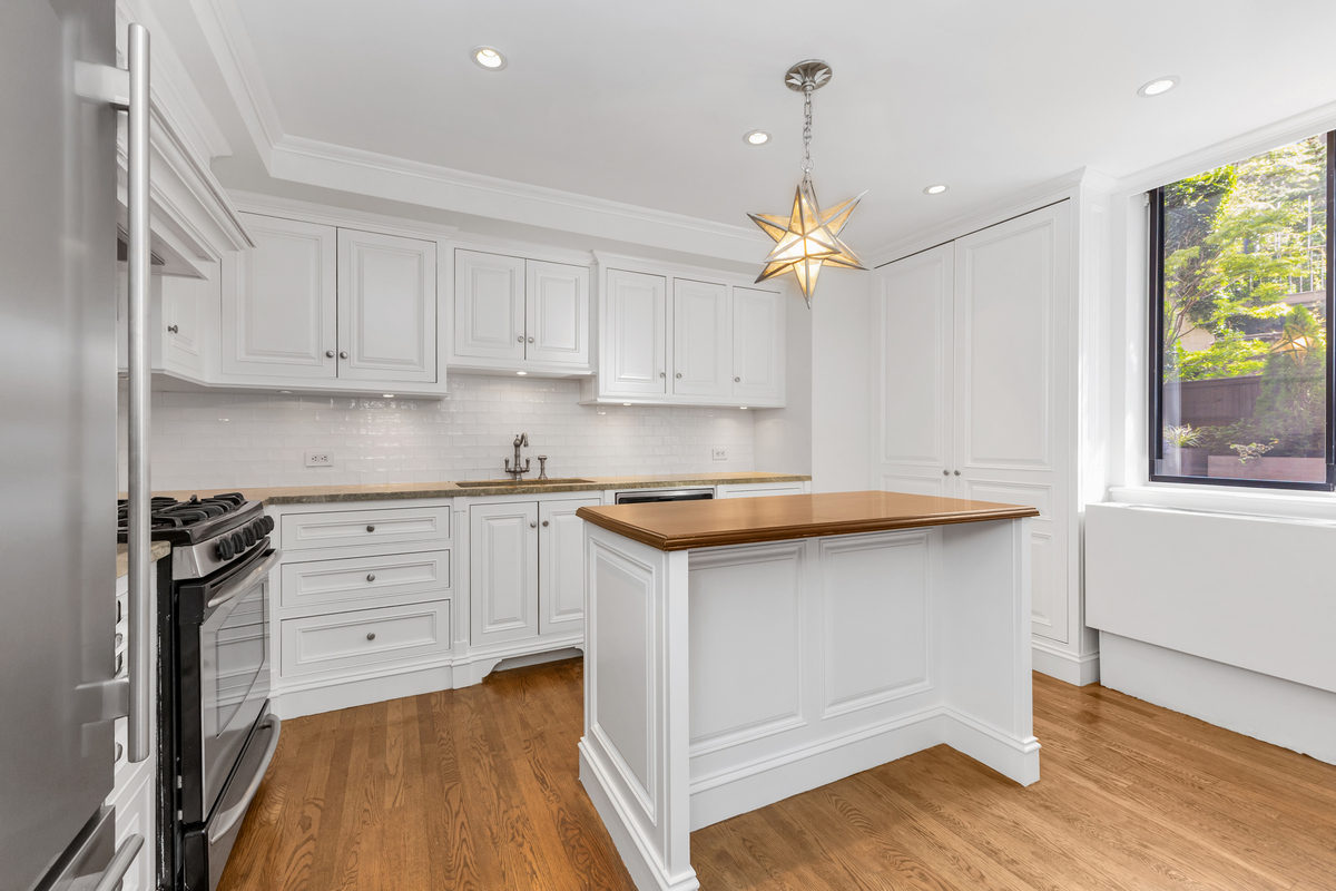 The lower level consists of a sprawling 16 x 20 foot open living/dining room with custom built ins, south and east exposures and a planted garden / terrace. The windowed eat in kitchen features a large center island with breakfast bar, custom cabinetry, stainless steel appliances, SubZero refrigerator and granite countertops with subway tile backsplash.
