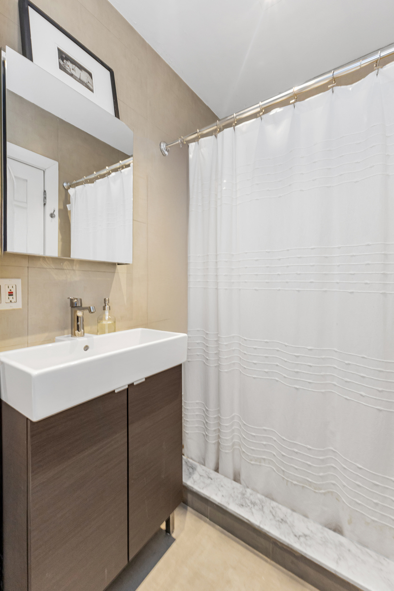 The renovated bathroom includes a shower, medicine cabinet, and elegant cabinetry.